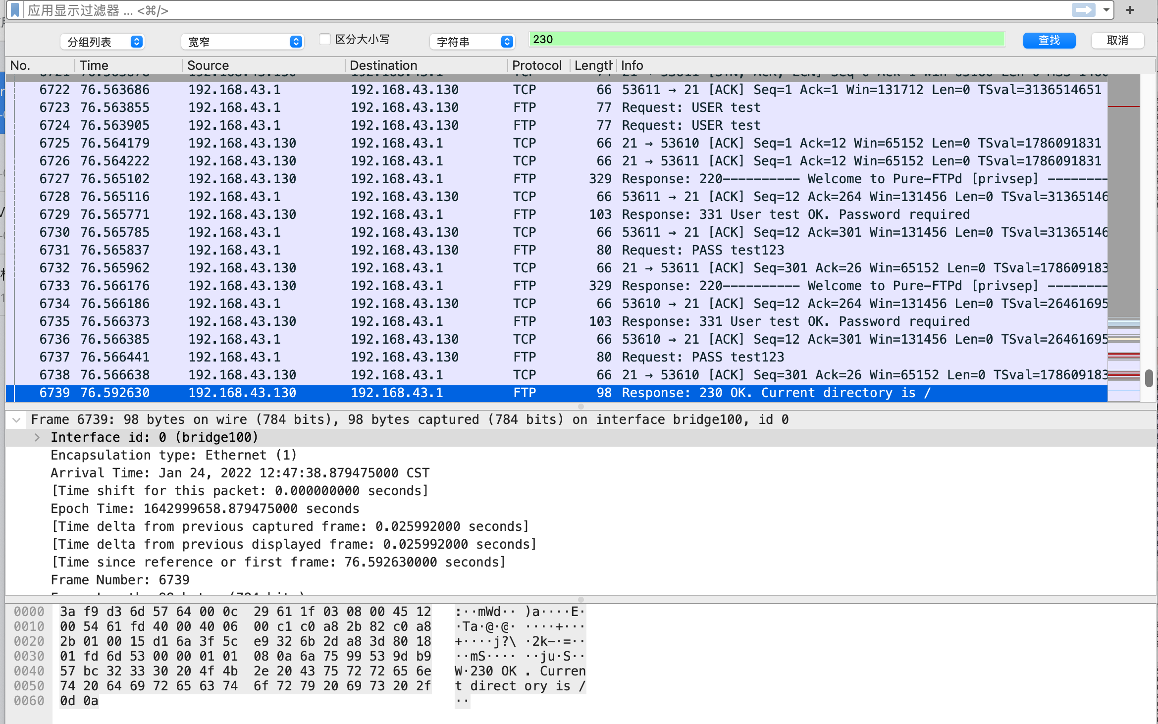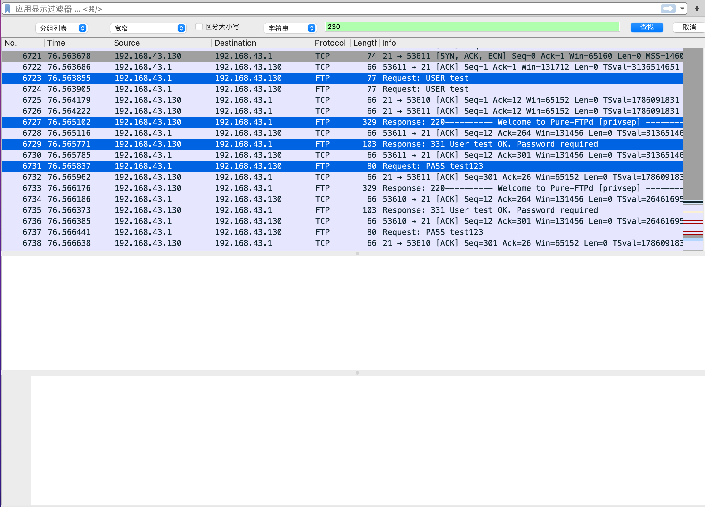 选择字符串搜索,可以搜索关键字password活着user或者Success等。 我这里搜索230,在ftp中,如果登陆成功,服务器会返回230状态码