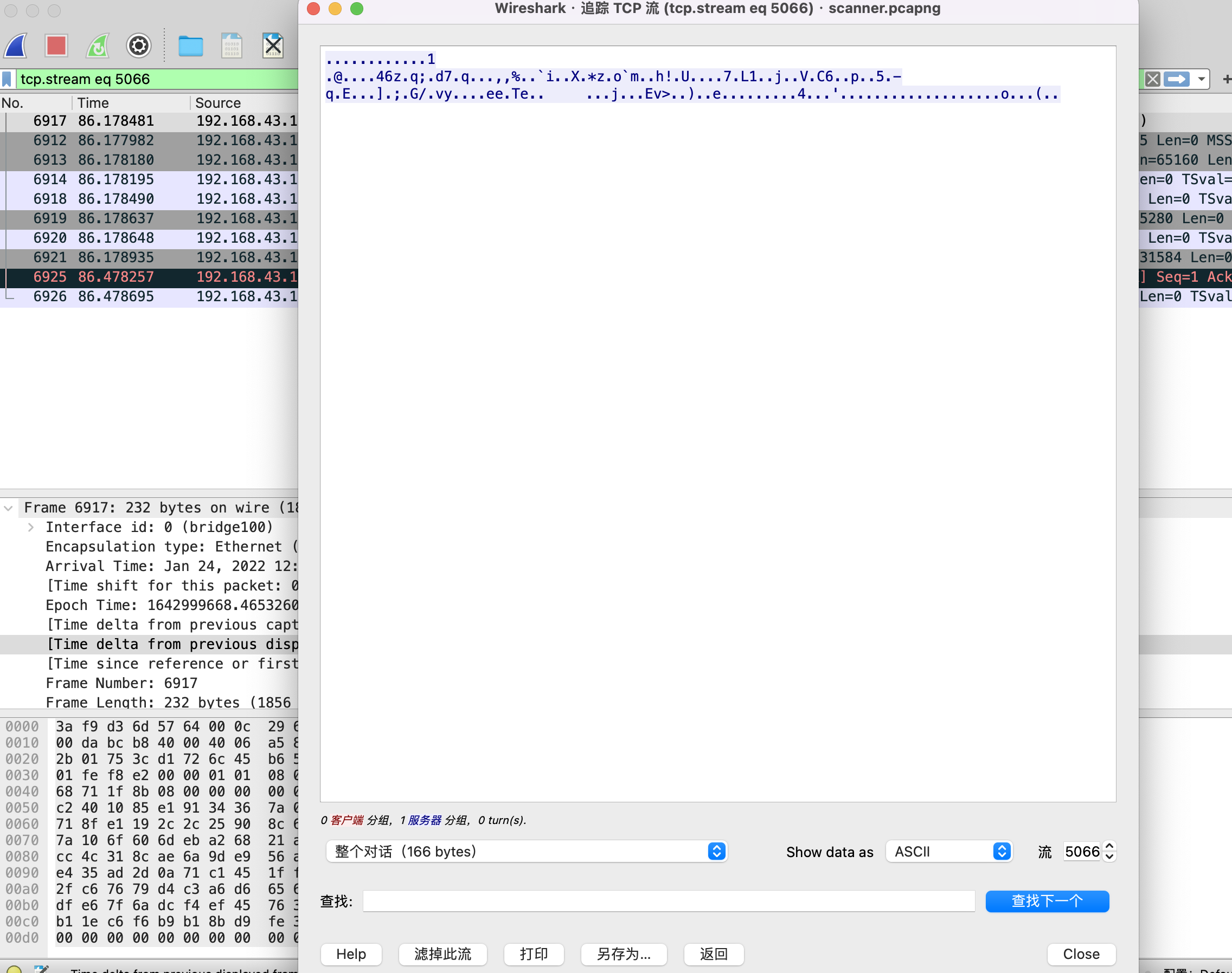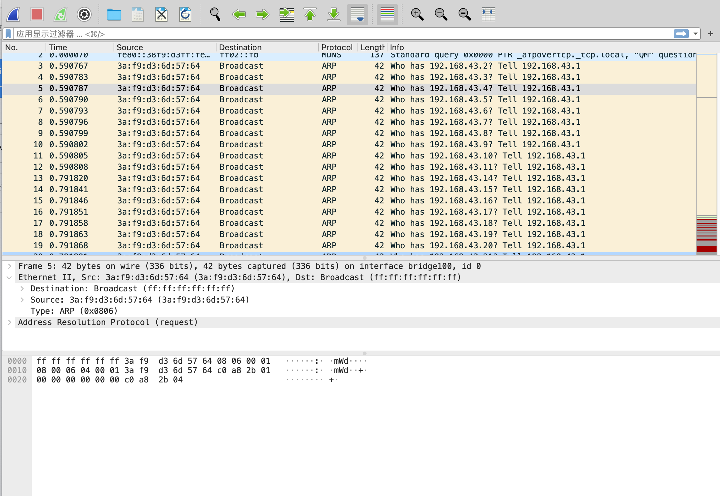 通过查看流量包,发现开头很多arp协议的流量。通过info字段查看,这似乎是一个扫描的数据包。不熟悉ARP协议的可以在网上自行学习。