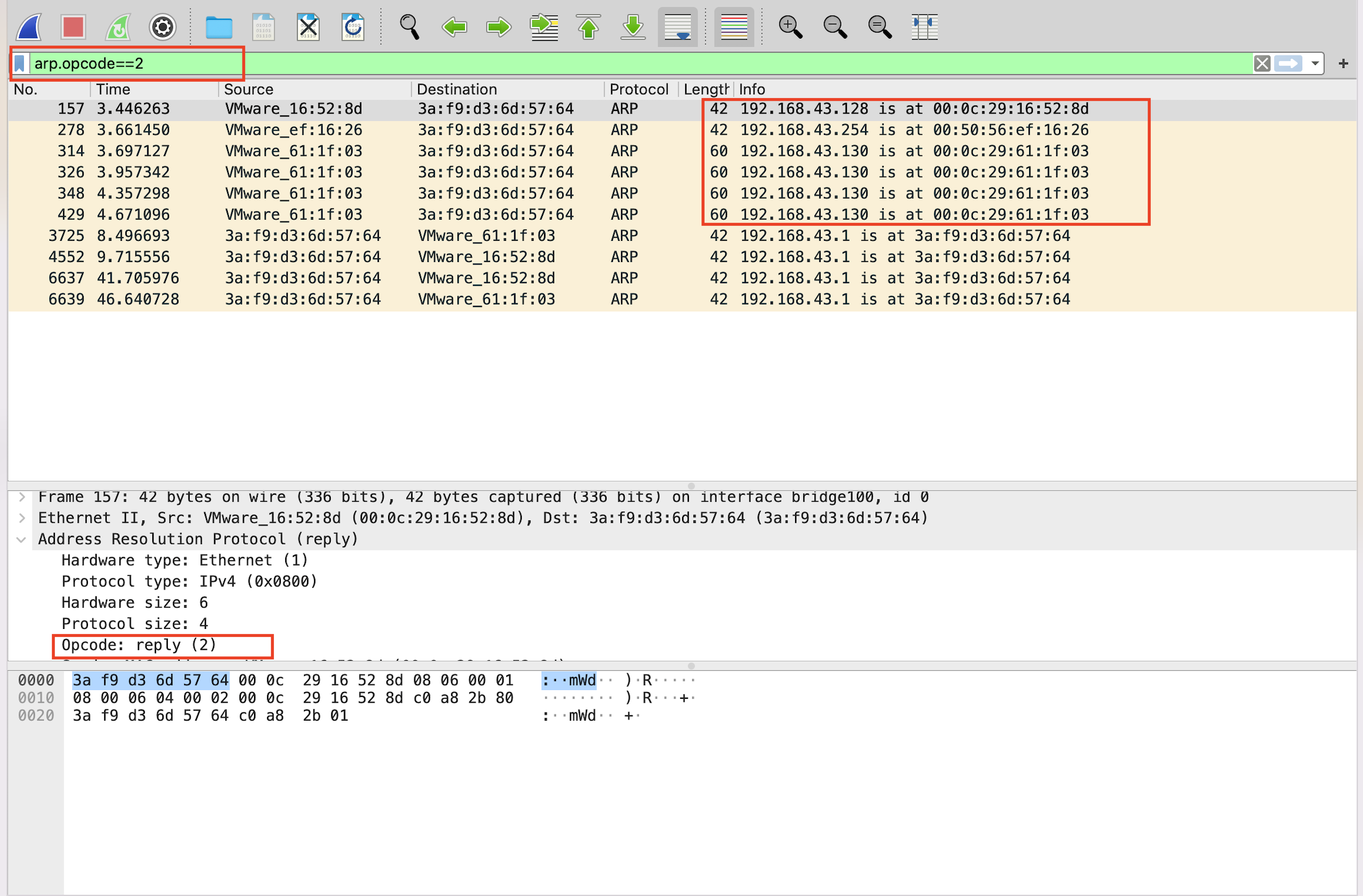 在arp的数据包中,应答包的opcode字段为2。 我们发现有三台主机进行了应答,分别为192.168.43.128、192.168.43.130、192.168.43.254.