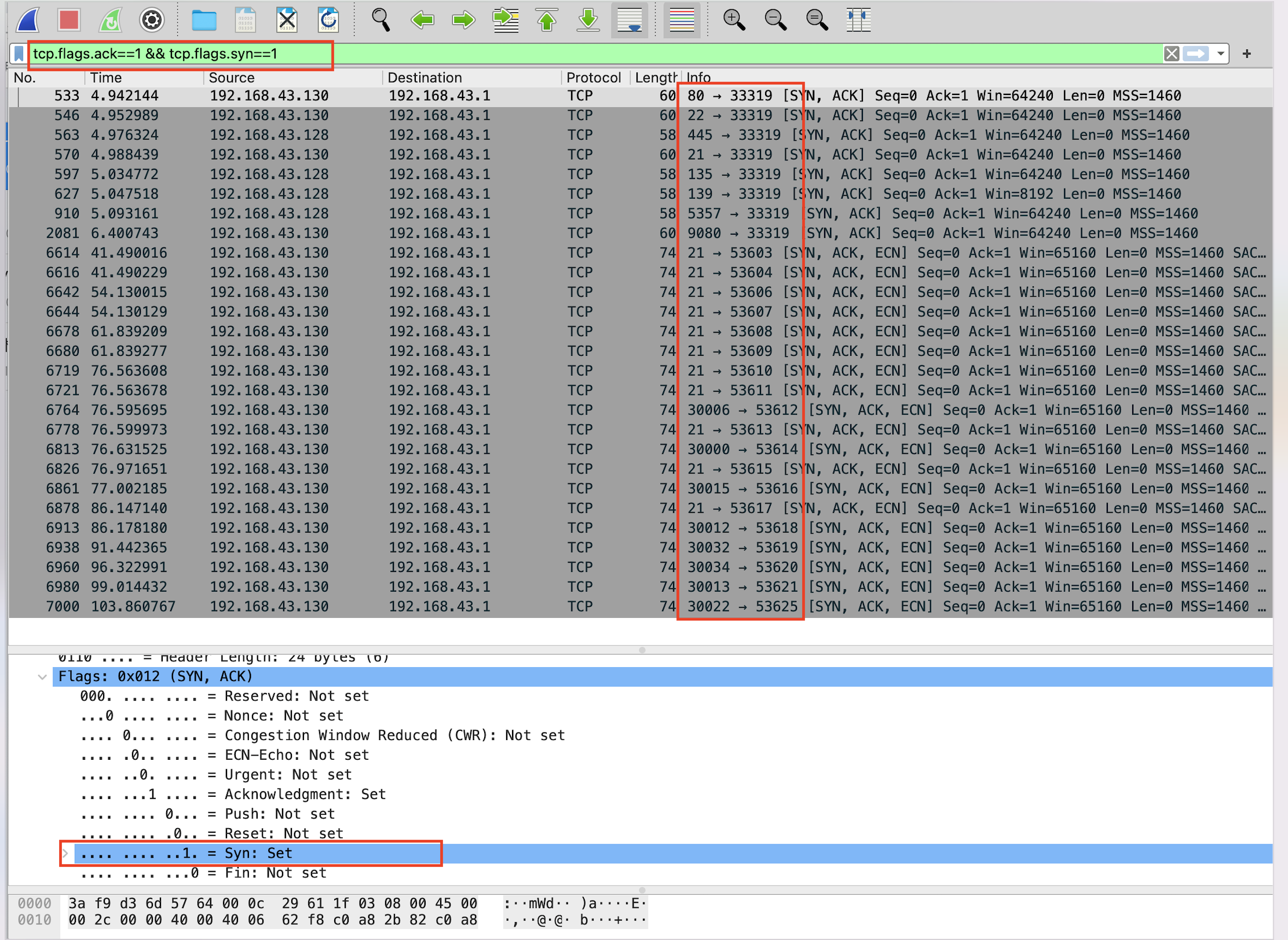 因为tcp进行连接的时候会有一个tcp三次握手,tcp三次握手为客户端先向目标发送一个syn=1,如果目标收到后则会回复一个syn=1和ack=1,然后客户端收到后回复一个ack=1。通过这一点,我们可以利用目标机的回复包进行筛选, tcp.flag.ack==1 && tcp.flags.syn==1。